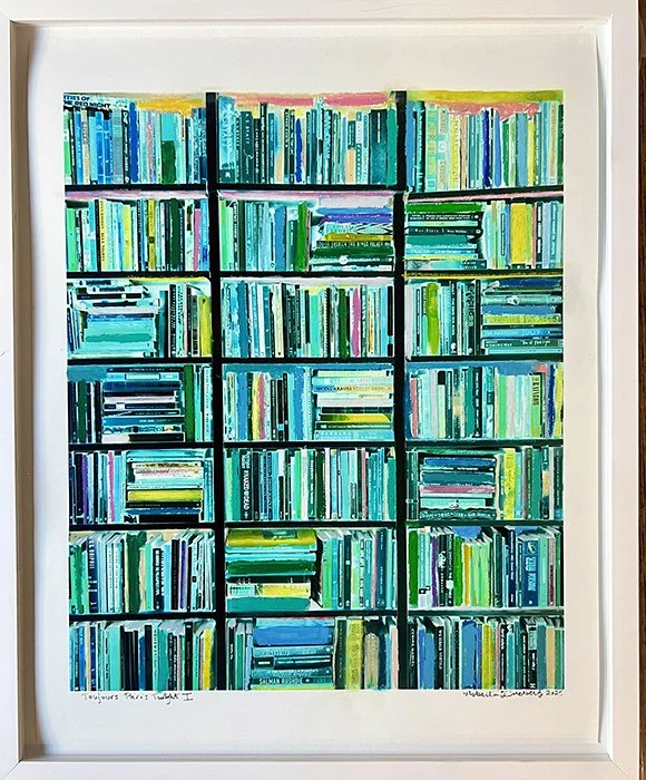 The mixed media art and collages on rag paper by RF is a.muse(d) highlight color fields, shape, design, and bright colors (pink, blue, emerald, and lavender). Many of the works are lens-based with oil pastel on both paper and canvas while the monoprints are made on an etching press.