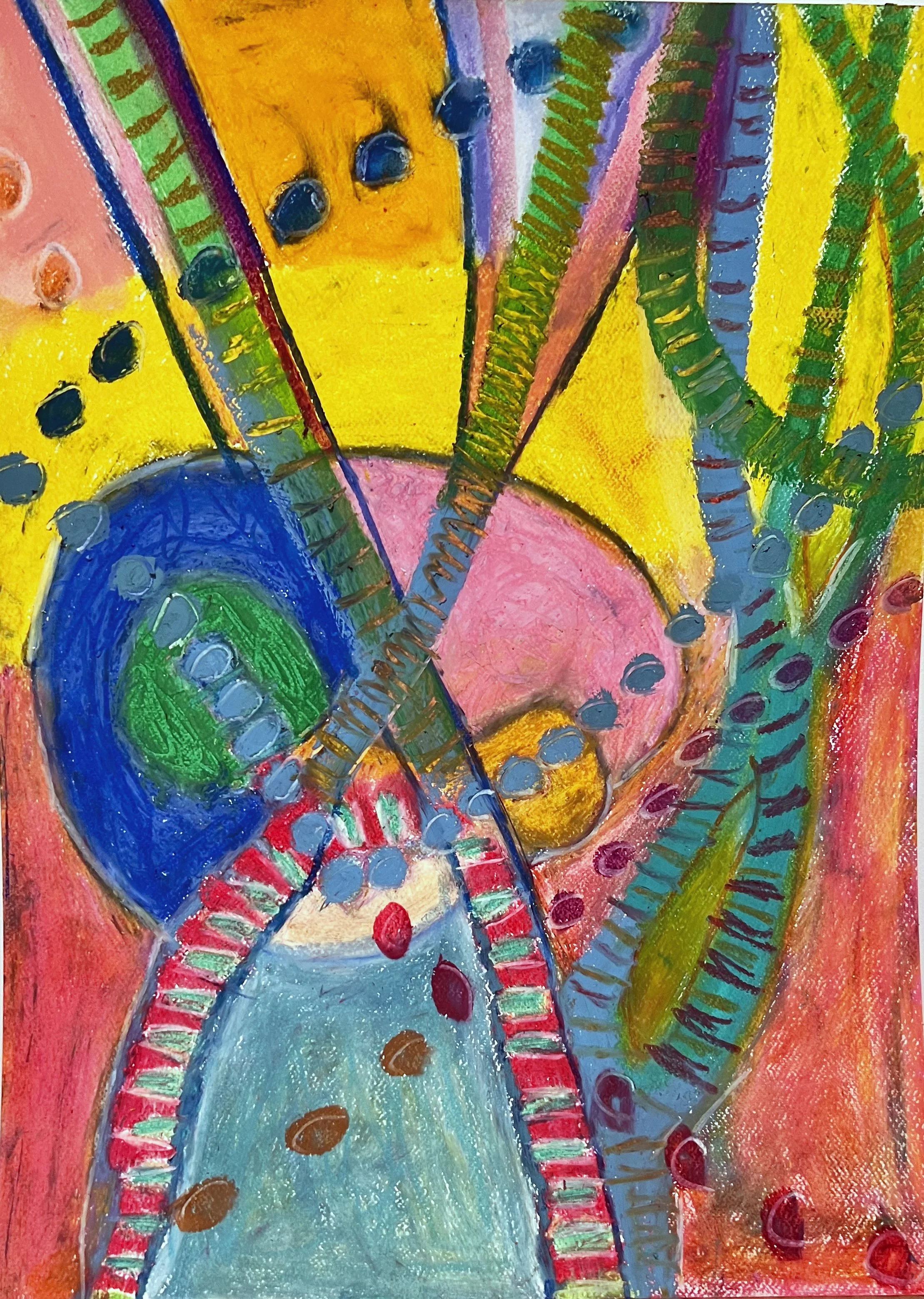 The mixed media paintings by RF is a.muse(d) integrate acrylic paint, oil pastels, and collaged materials. Warm and cool colors are built up on the substrate by scraping away the surface. Sand sometimes provides texture, with the course and rough adding to the surface rawness. Paintings are often semi-abstract and are made on either paper or canvas.